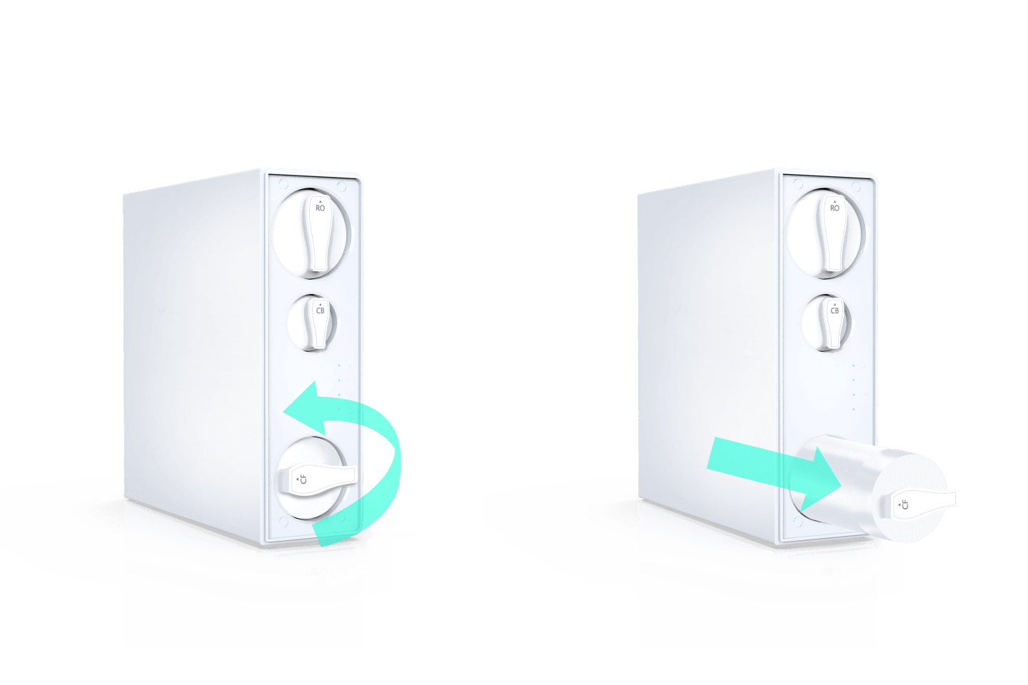 يشير مؤشر اللون الموجود على صنبور المياه النقية واللوحة الأمامية للفلتر إلى ضرورة تغيير الفلاتر البديلة.